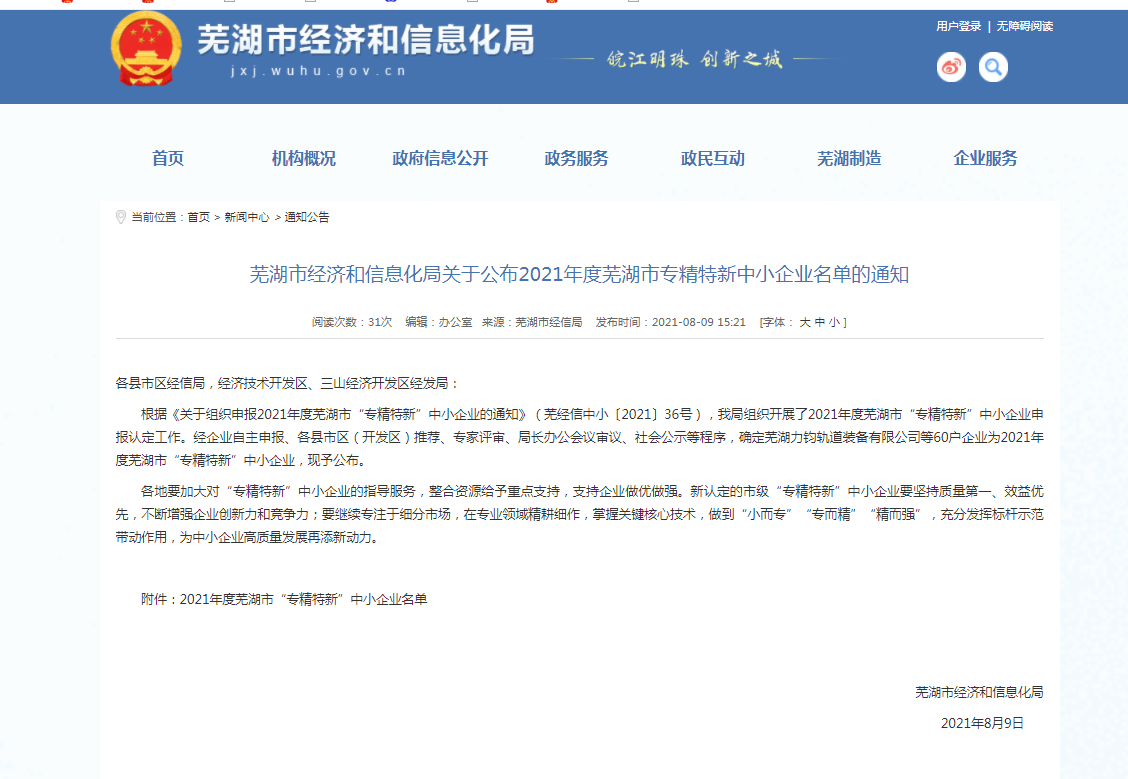 近日,經(jīng)蕪湖市經(jīng)濟和信息化局嚴(yán)格審核評定,授予我公司“蕪湖市專精特新中小企業(yè)”榮譽稱號。