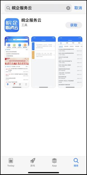 2、蘋果手機(jī)用戶在 APP Store 里搜索“皖企服務(wù)云” 并點(diǎn)擊“獲取”下載安裝;