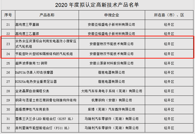 2021年1月11日,安徽省高新技術(shù)產(chǎn)品認定名單正式公布。我公司產(chǎn)品“余熱余壓資源綜合利用發(fā)電高效小微背壓式汽輪機組、節(jié)能型葉片型線和隔板結(jié)構(gòu)的汽輪機組”兩項產(chǎn)品喜獲認定,這次獲得高新技術(shù)產(chǎn)品認定再一次驗證了安徽譽特雙的卓越品質(zhì),同時也是對我司產(chǎn)品權(quán)威的肯定!