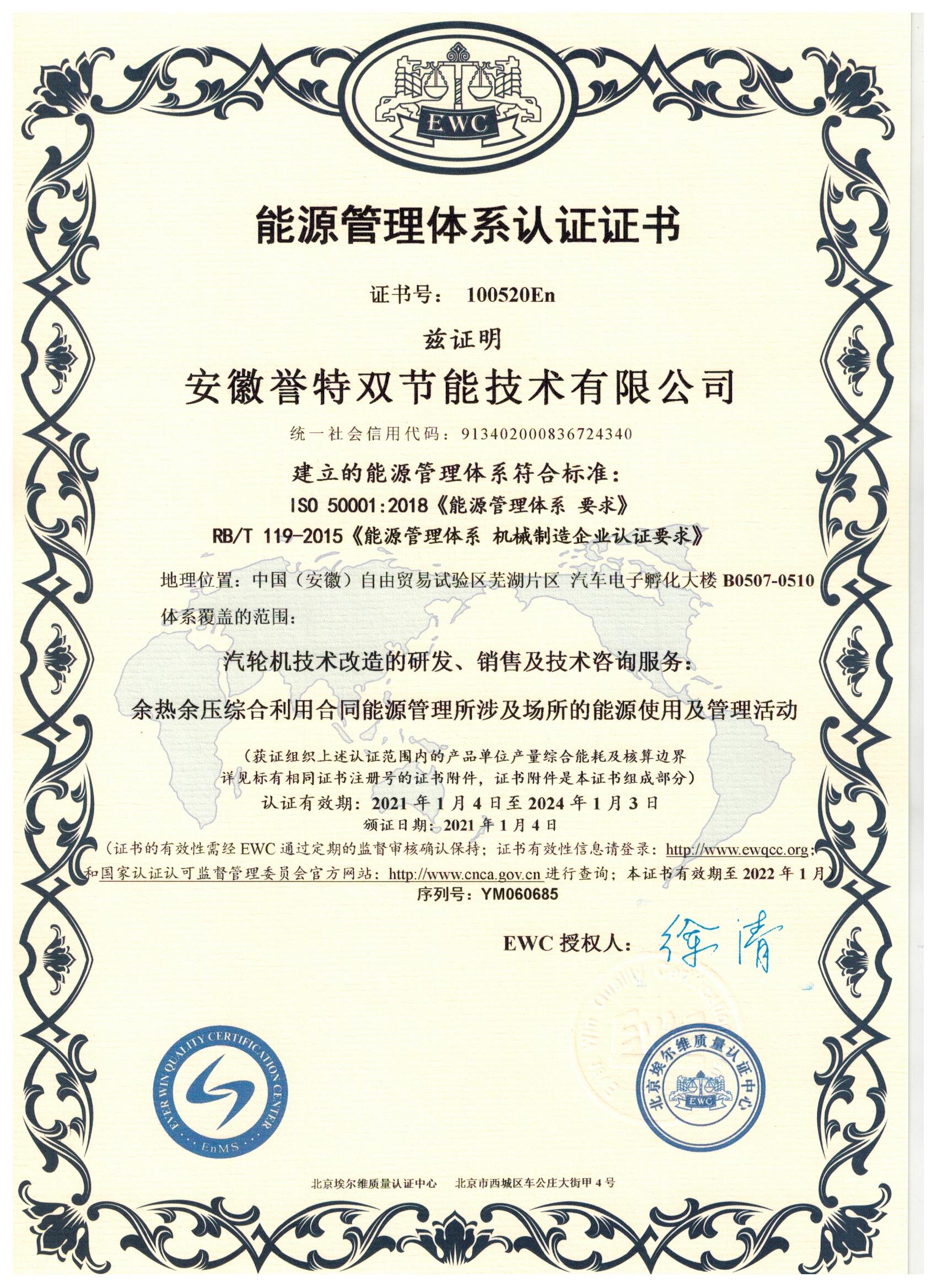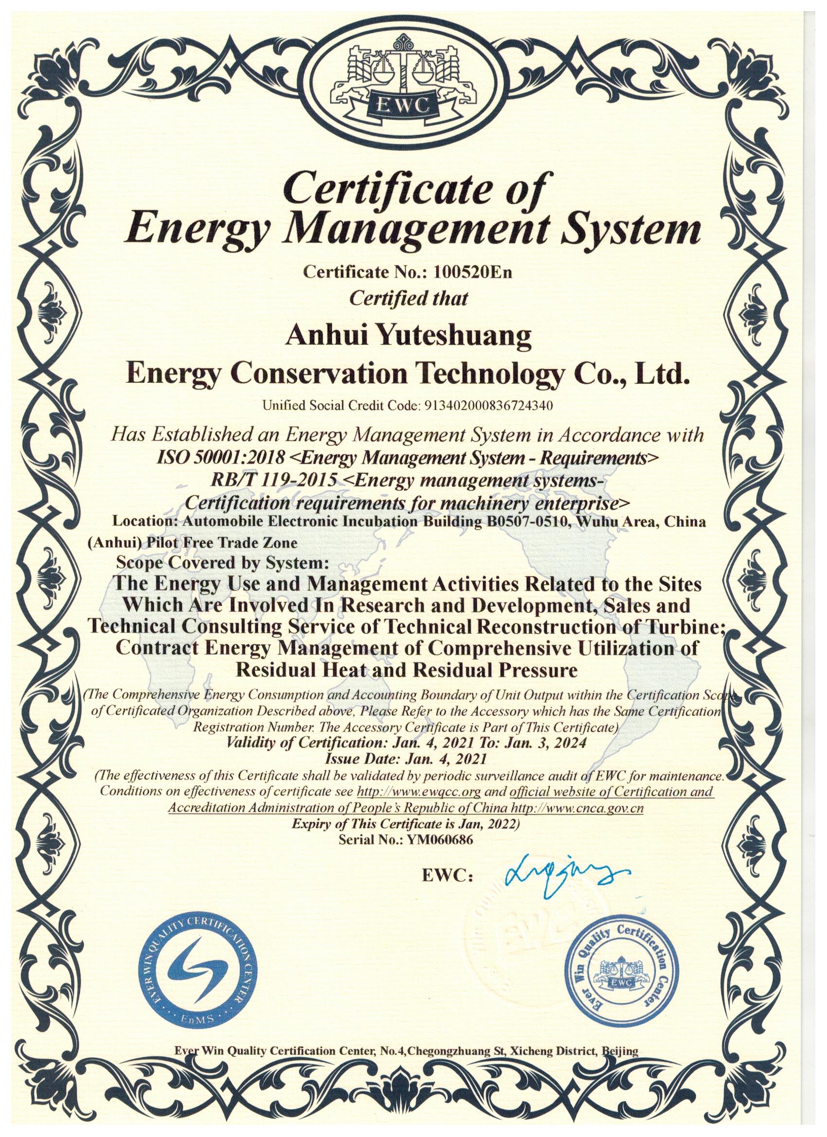 2020年1月7日,我公司能源管理體系順利通過北京埃爾維質(zhì)量認(rèn)證中心的現(xiàn)場審核,并榮獲能源管理體系認(rèn)證證書。