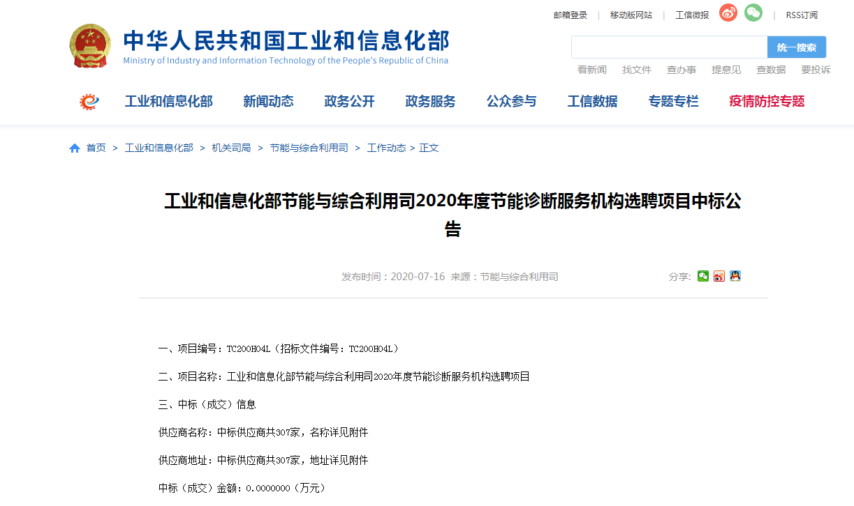 2020年7月15日,公司成功中標(biāo)工業(yè)和信息化部節(jié)能與綜合利用司“2020年度國家節(jié)能診斷服務(wù)機構(gòu)選聘項目合格供應(yīng)商”.