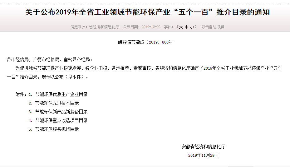熱烈祝賀我公司入選安徽省2019年度全省工業(yè)領(lǐng)域節(jié)能環(huán)保產(chǎn)業(yè)“五個(gè)一百”推介目錄