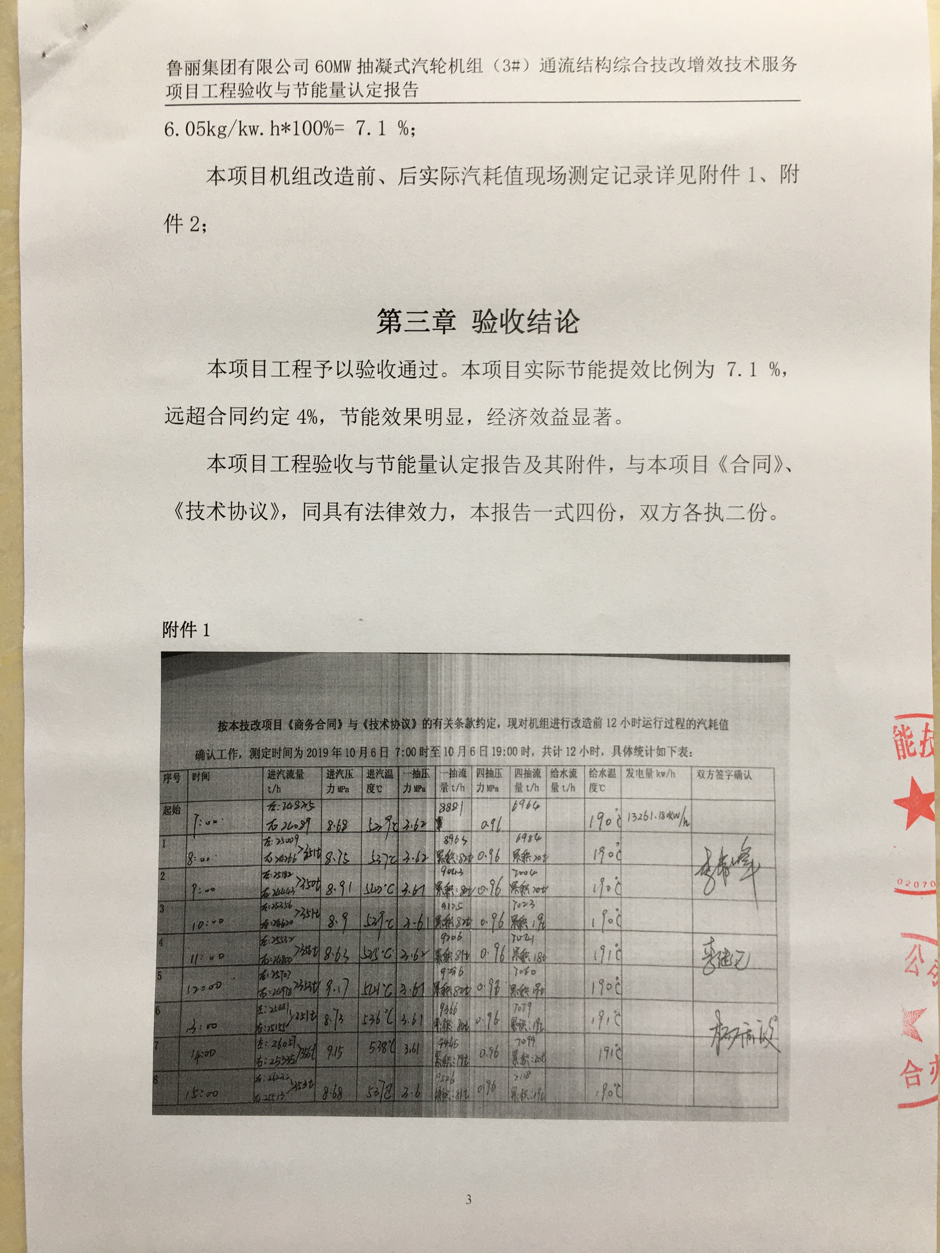 2020年1月2日上午,我公司技術服務項目——魯麗集團有限公司60MW雙抽凝式汽輪機組通流結(jié)構(gòu)綜合技改提效項目,通過節(jié)能量認定和工程驗收。