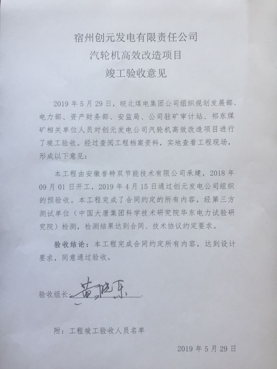 對(duì)我公司以EPC模式實(shí)施的宿州創(chuàng)元發(fā)電有限責(zé)任公司,兩臺(tái)12MW汽輪發(fā)電機(jī)組通流結(jié)構(gòu)綜合技改提效項(xiàng)目進(jìn)行全系統(tǒng)工程驗(yàn)收,驗(yàn)收結(jié)論:本工程完成合同約定所有內(nèi)容,達(dá)到設(shè)計(jì)要求,同意通過(guò)驗(yàn)收!