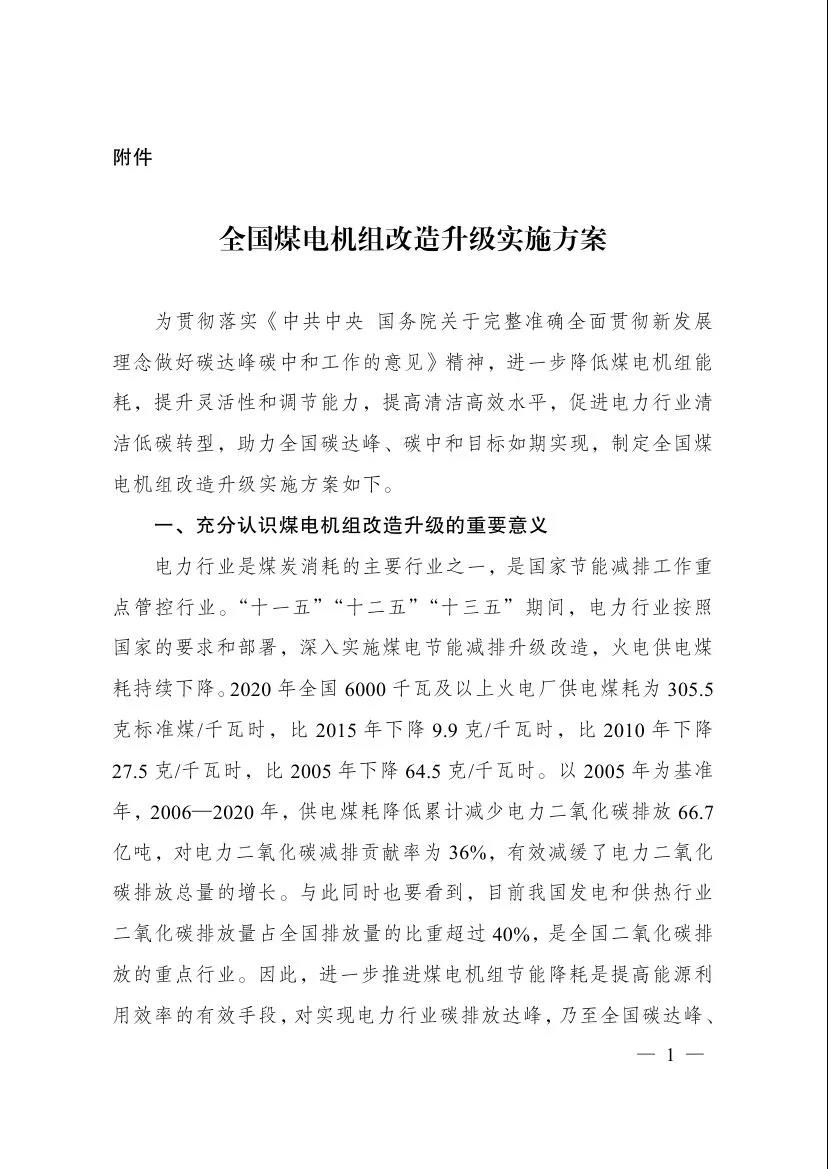 為認真貫徹落實《中共中央 國務院關(guān)于完整準確全面貫徹新發(fā)展理念做好碳達峰碳中和工作的意見》精神,推動能源行業(yè)結(jié)構(gòu)優(yōu)化升級,進一步提升煤電機組清潔高效靈活性水平,促進電力行業(yè)清潔低碳轉(zhuǎn)型,助力全國碳達峰、碳中和目標如期實現(xiàn),國家發(fā)展改革委、國家能源局會同有關(guān)方面制定了《全國煤電機組改造升級實施方案》(以下簡稱《實施方案》),現(xiàn)印發(fā)你們,請遵照執(zhí)行?,F(xiàn)將有關(guān)落實事項通知如下: