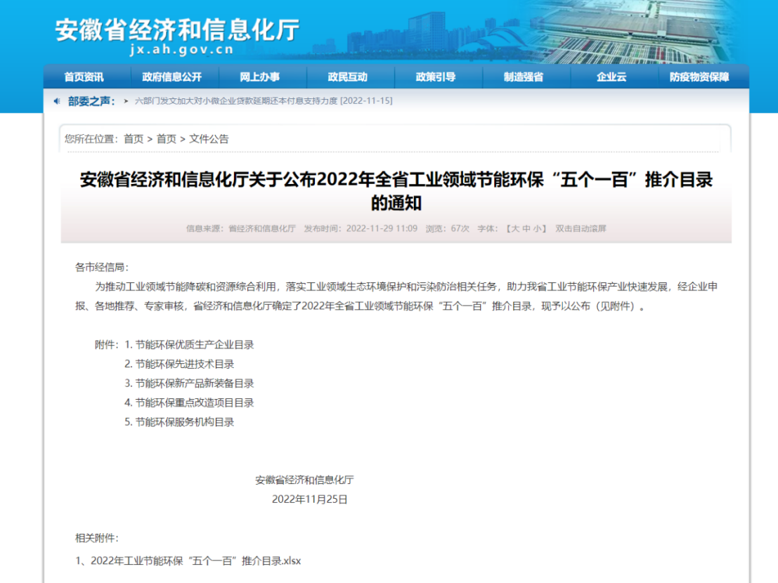 2022年11月25日,安徽省經信廳發(fā)布2022年度全省工業(yè)領域節(jié)能環(huán)保產業(yè)“五個一百”推介目錄,我公司三個項目喜獲認定。