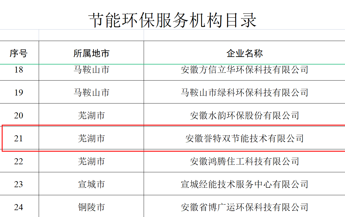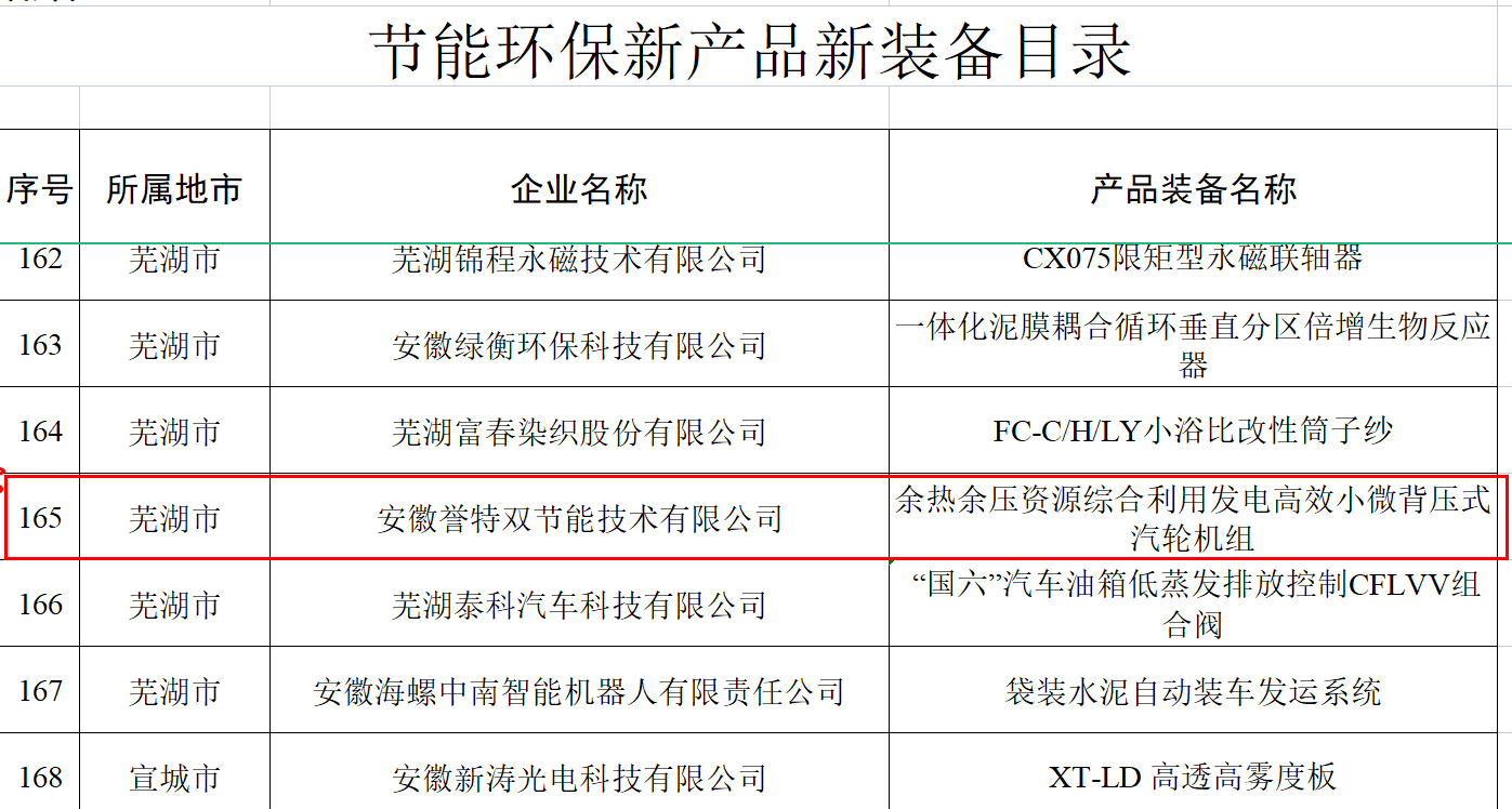 我安徽譽特雙節(jié)能技術有限公司入選省“節(jié)能環(huán)保服務機構目錄”、核心產品“余熱余壓資源綜合利用發(fā)電高效小微背壓式汽輪機組”入選節(jié)能環(huán)保新產品新裝備目錄、核心技術“余熱余壓資源綜合利用領域節(jié)能汽輪發(fā)電技術”入選節(jié)能環(huán)保先進技術目錄。其中,節(jié)能環(huán)保服務機構目錄名單,安徽省全行業(yè)領域共29戶,蕪湖市僅3戶,我公司榮登榜單,此次入選,為公司連續(xù)五年入選,在此表示熱烈祝賀。