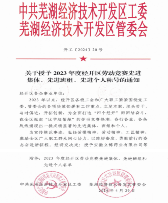喜訊---熱烈祝賀公司總經(jīng)理榮獲2023年度蕪湖市經(jīng)開(kāi)區(qū)勞動(dòng)競(jìng)賽“先進(jìn)個(gè)人”榮譽(yù)稱號(hào)
