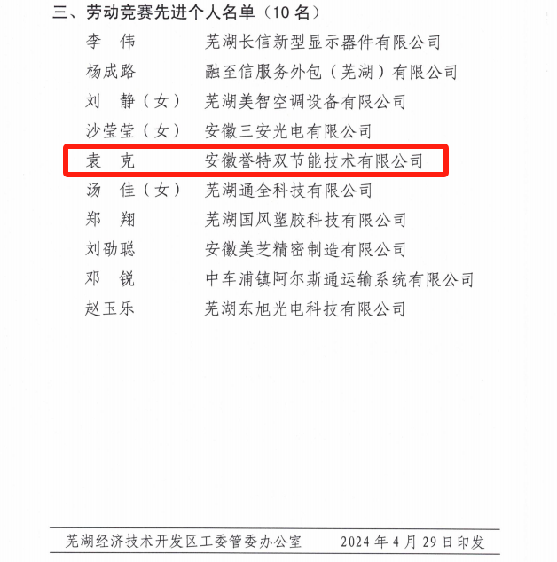 2024年4月29日,中共蕪湖經(jīng)濟(jì)技術(shù)開(kāi)發(fā)區(qū)工委、蕪湖經(jīng)濟(jì)技術(shù)開(kāi)發(fā)區(qū)管委會(huì)發(fā)布《關(guān)于授予2023年度經(jīng)開(kāi)區(qū)勞動(dòng)競(jìng)賽先進(jìn)集體、先進(jìn)班組、先進(jìn)個(gè)人稱號(hào)》通知文件,我公司總經(jīng)理袁克榮獲“先進(jìn)個(gè)人”榮譽(yù)稱號(hào),在此表示熱烈祝賀。