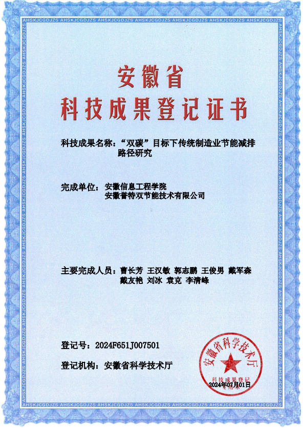 近日,我公司與安徽信息工程學院聯(lián)合研發(fā)的科技成果--“雙碳目標下傳統(tǒng)制造業(yè)節(jié)能減排路徑研究”通過安徽省科學技術廳登記認證,并發(fā)布登記證書。